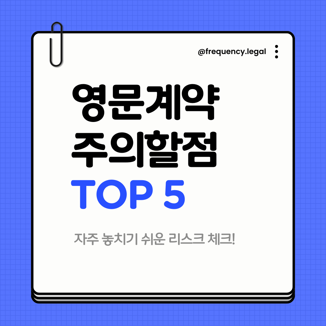 Reika . 18/08/2025 Reika . 18/08/2025 Frequency Legal – 서비스 안내 Frequency Legal 서비스 안내 - 해외 영문 계약, 더이상 어렵지 않게 Read More Reika . 17/08/2025 Reika . 17/08/2025 영문 계약 검토시 자주 나오는 리스크 TOP 5 영문 계약은 표현이 단순해 보여도 실제 의미, 리스크 분배, 사업 흐름 반영까지 꼼꼼히 보지 않으면 나중에 불리한 상황에 놓이는 일이 많으니, 반드시 한 번씩 체크해보는 것이 중요합니다. Read More